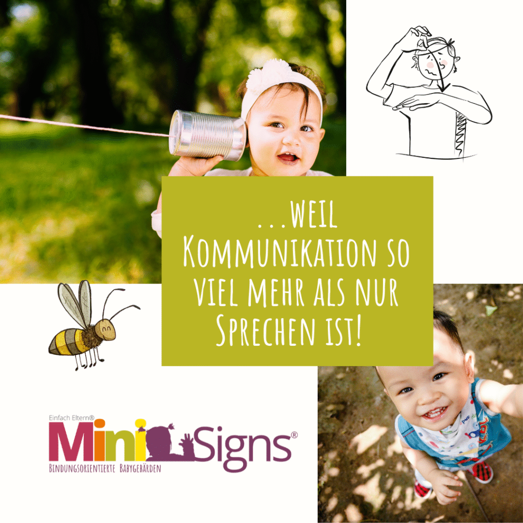 MiniSigns ist ein bindungs- und beziehungsorientierter Babygebärdenkurs und richtet sich an Eltern mit Kindern im Alter von 6 bis 18 Monaten. In unseren Kursen vermitteln wir Gebärden rund um den Alltag, aber auch entwicklungsspezifische Gebärden, die sowohl für die Kinder, als auch für die Eltern interessant sind.